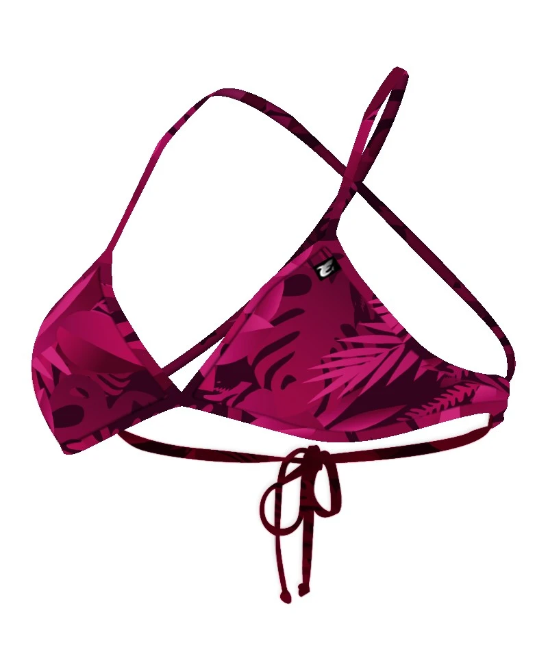 Laissez-vous tenter par l’univers tropical de ce haut de maillot de bain triangle Leaves Forest aux couleurs rose cerise avec le dos noué imprimé, doublure noire.